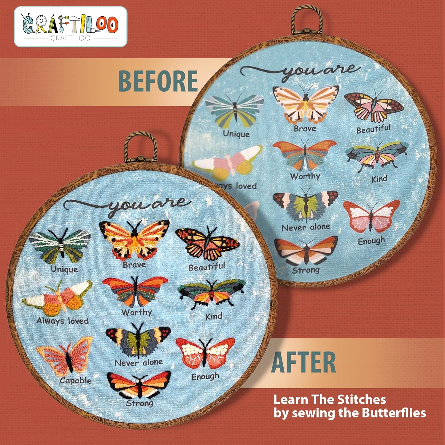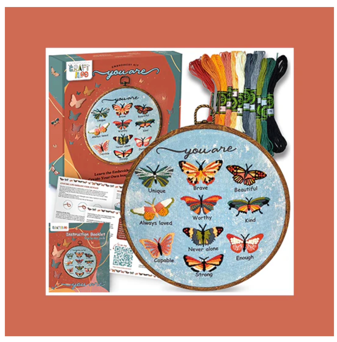 [OFF SCREEN OPPORTUNITY CREATING ART] our beginner embroidery kits for adults are great for discovering the joy of sewing craft projects & spending time in an artistic way. Learning to stitch and sew a beautiful Butterfly pattern project