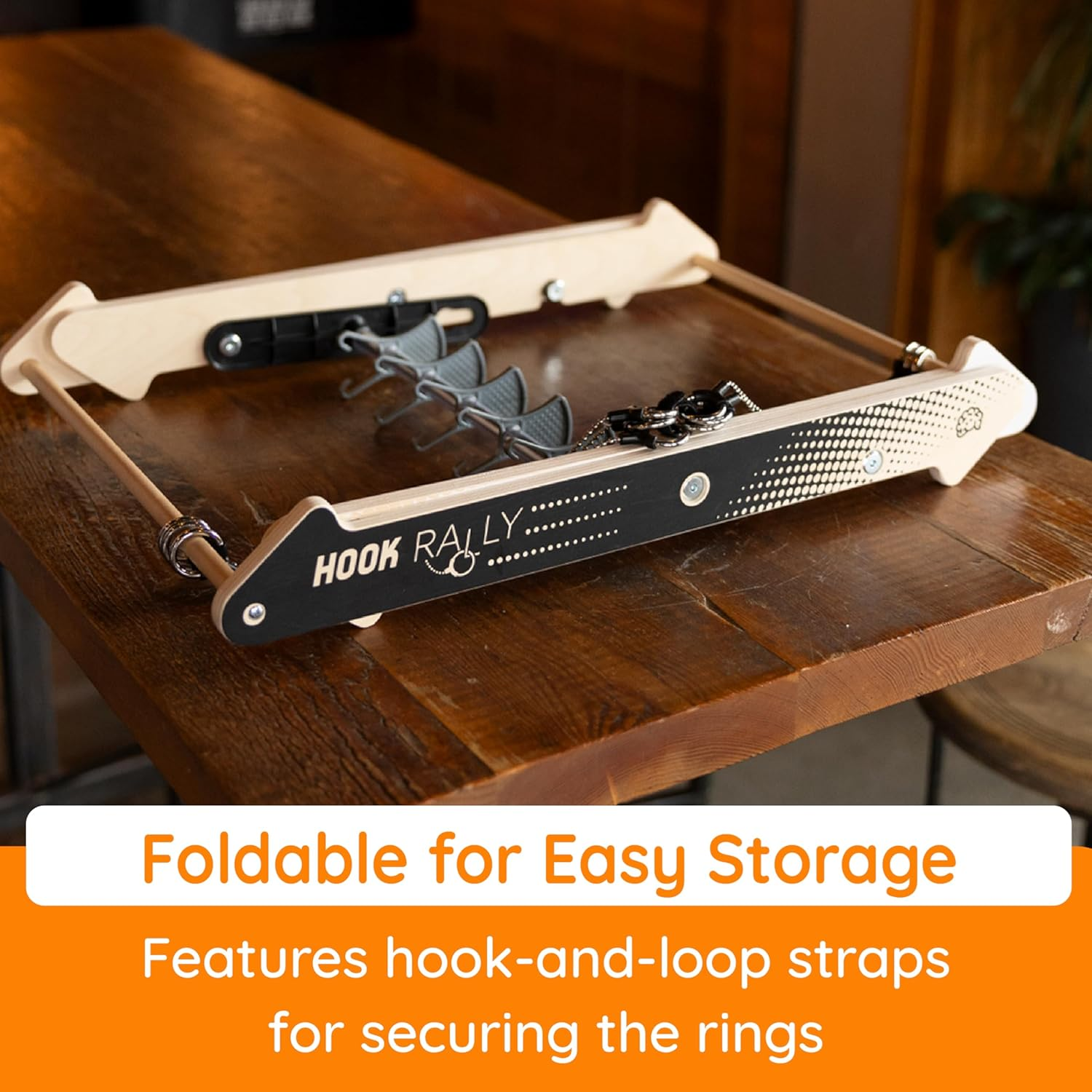 Swing 'em, hook 'em, and win! In this fast-paced twist on a classic game, players take their positions on opposite sides of the wooden frame and start at the same end so they're both competing for the same hook. Then, players start swinging their rings to try and capture the hooks one at a time. Once you've captured a hook, your opponent can't reach it. If you knock a ring off of a hook that you've already captured, you have to go back and recapture it before your opponent does. The first player to capture three of the five hooks wins the game! Fast-paced, uniquely challenging, and foldable for easy storage, Hook Rally is an instant family favorite!