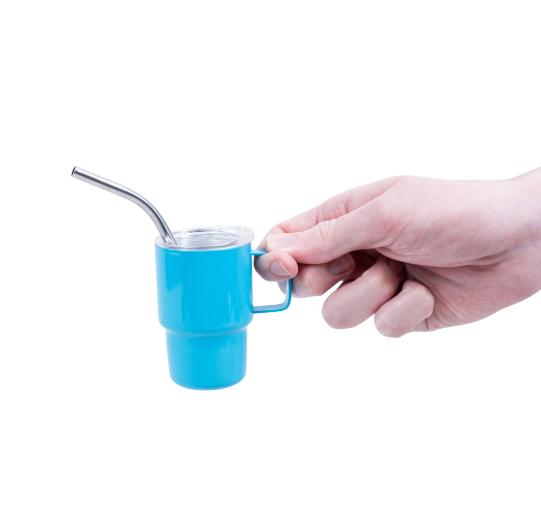 - This tiny 3oz mug showcases a vibrant turquoise finish and comes paired with a matching mini metal straw – making it an adorable and functional accessory for on-the-go refreshments.