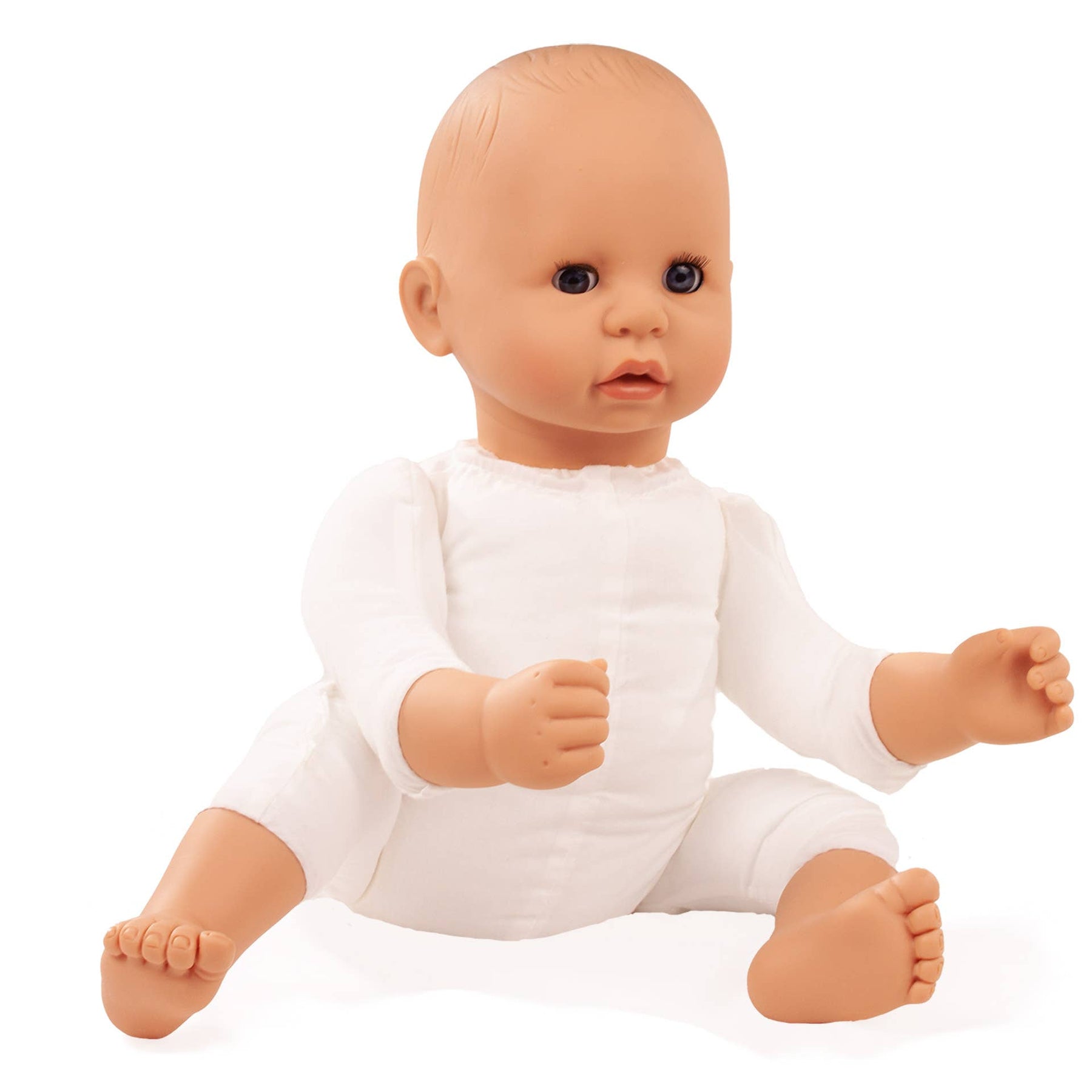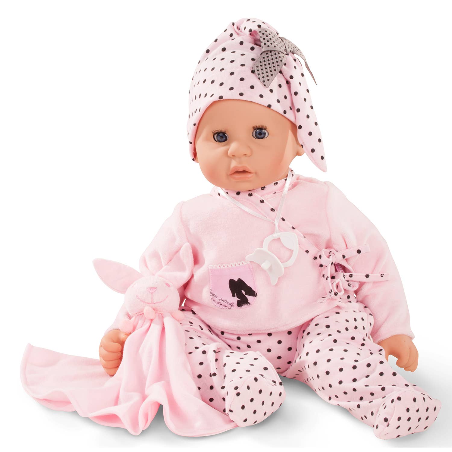 Gotz Cookie 19" Soft Baby Doll in Pink with Blue Sleeping Eyes and Accessories. Cuddly 19" baby Cookie has a soft weighted cloth/vinyl body with beautiful blue eyes that open and close. Rotational joints at the hips allow Cookie to sit without support, and the partially open mouth will hold the included pacifier. The washable baby doll is dressed in a darling 3-pc set with a pink long-sleeve side-tie top, pink and black dot-footed pants, and a matching hat. Accessories include a pacifier and a pastel pink snuggle bunny blankie. Gotz dolls are of the highest quality and meticulously crafted to encourage creative and educational play. All materials used are tested according to strict guidelines and contain no harmful dyes and plasticizers. Doll comes in a retail friendly window box.